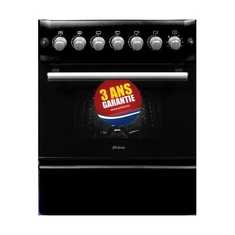 Cuisinière à Gaz Orient OC-60-60TN- Nombre de feux : 4 – Largeur : 60 cm – Puissance de Grille à gaz: 1900 Watts – Puissance de Four à gaz: 2200 Watts – Puissance de Brûleur: 1 x gros Brûleur: 2300 Watts, 2 x Moyenne Brûleur: 15000 Watts, 1 x petit brûleur: 850 Watts – Surface de la table de cuisson: Blanche – Avec Tourne broche – Fonction d’allumage: Electrique avec bouton – Porte four: Double vitrage – Fonction de sécurité gaz – Nombre de four: Double grilloir – Minuterie – Facile à nettoyer – Fonction de sécurité gaz – Pieds Réglables – Dimensions: 880 x 570 x585 mm – Poids: 37 Kg – Gaz Naturel – Couleur : Noir – Garantie : 3 ans