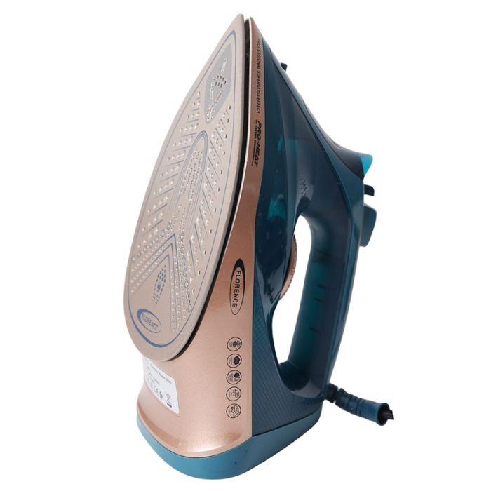 Fer a repasser FLORENCE – Puissance: 2200 Watts – Système anti-goutte – Contrôle de la température – Vapeur verticale pour défroisser les vêtements suspendus comme les rideaux ou les costumes – Autonettoyant – Semelle: Céramique – Couleur: Vert – Garantie: 1an