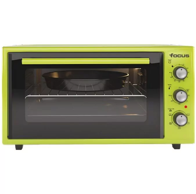 Four Électrique Focus – Puissance: 2000 Watts – Volume: 45 Litres – Température: Réglable jusqu’à 250°C – Minuterie: 90 min – Chaleur tournante – 6 Fonctions – Fonction Yaourt – Cavité Emaillée – Thermostat capillaire – Alimentation: 220-240V/50-60hz – 1 x Grill – 1 x Plateau rectangulaire – 1 x Plateau Rond – Dimensions: L x H x P: 50.5 x 32.45 x 37.96 cm – Couleur: Vert – Garantie: 1an