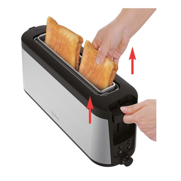 Grille Pain TEFAL – Puissance: 1000 Watts – 1 fente longue – 4 fonctions: Décongelation, Réchauffage, Stop, Baguette – Thermostat 7 positions réglables – Centrage automatique du pain pour griller uniformément – Support viennoiseries intégré – Ramasse-miettes amovible – Couleur: Inox – Garantie: 1 an
