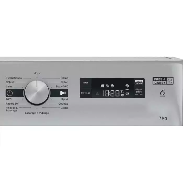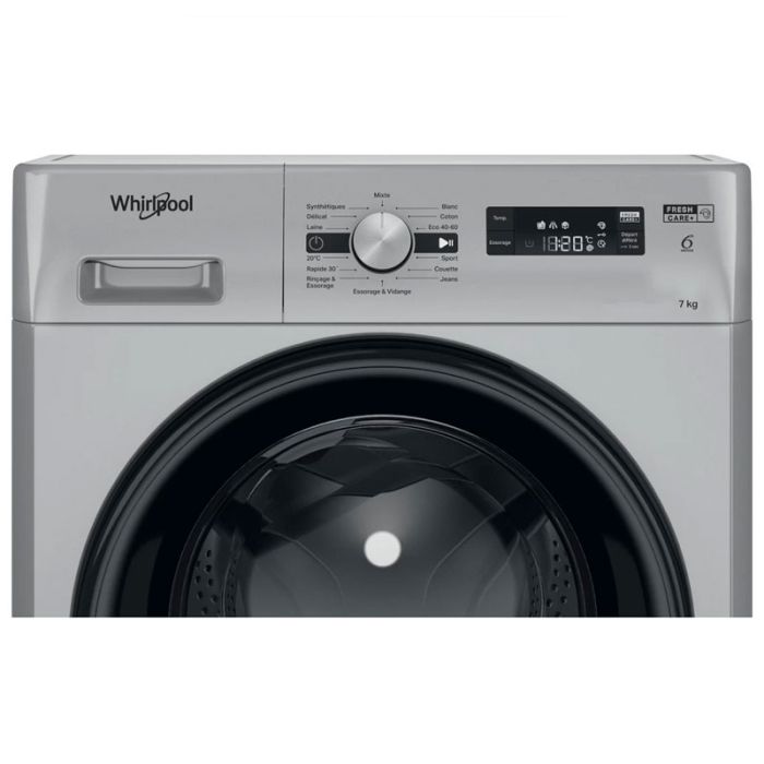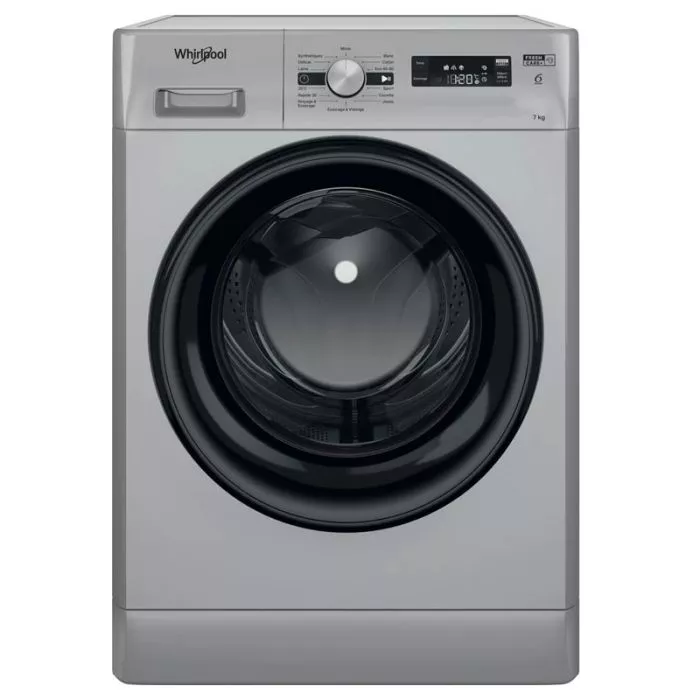 Lave linge Frontal WHIRLPOOL – Capacité de lavage: 7 kg – Consommation d’eau annuelle: 10630 L/an – Puissance: 1850W – Vitesse d’essorage: 1200 tours /min – Efficacité Énergétique: A+++ – Classe d’éfficacité d’essorage: B – Consommation d’énergie annuelle: 198 KW/An – Nombre de Programmes: 13 programmes : Coton 40°, Coton 60°, Mix 40°, Synthétiques 30°, Laine, Rapide 30′, Duvets, Délicats, Sport, Rinçage + Essorage, Essorage + Vidange, Eco 40-60 , 20°C – Sécurité enfant – Technologie: 6ème Sens – FreshCare+ – Steam Refresh – Pieds ajustables – Niveau sonore: Essorage: 79 db / Lavage: 59 db – Longueur du cordon: 120 cm – Dimensions: H x L x P: 84.5 x 59.5 x 57.5cm – Poids: 65 kg – Couleur: Silver – Garantie: 2 ans + 10 ans sur moteur