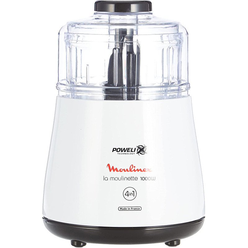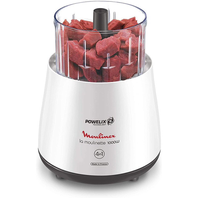Mini Hachoir MOULINEX – Puissance: 1000 Watts – Capacité: 330 g – Nombre de vitesse: 3 vitesses – Technologie de lammes powerlix – Bol en plastique – Bol gradué – Couteau démontable – Couleur Blanc – Garantie 1 an