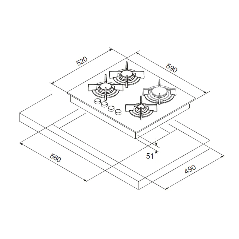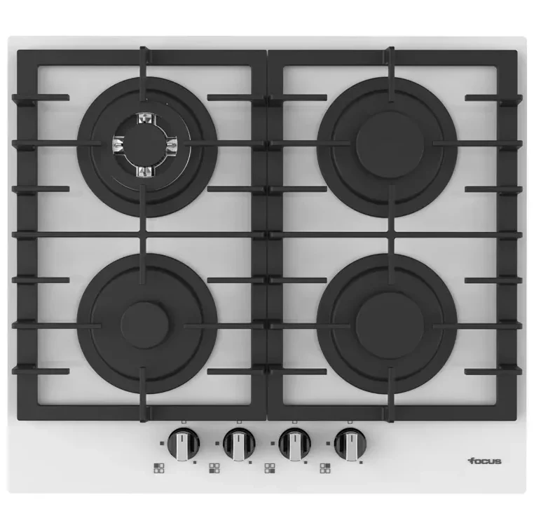 Plaque de Cuisson FOCUS Vitro Blanc – Type de Plaque: à Gaz – Largeur: 60 cm – Nombre de Foyers: 4 foyers – Grilles et chapeaux de brûleurs en fonte – Flamme stabilisée – Allumage automatique – Commandes: frontales – Dimensions: 520 x 590 x 51 mm – Couleur: Blanc – Garantie: 2 ans