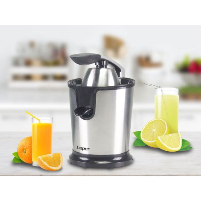 Presse agrumes BEPER – Puissance: 85W – Récipient avec bec anti-goutte – Rotation automatique pour un pressage optimal – 2 cônes différents fournis pour les petits et les gros agrumes – Base antidérapante pour assurer la stabilité et l’enroulement – Facile à démonter et à nettoyer – Corps en acier avec levier pour faciliter l’essorage – Couleur: Inox – Garantie: 1an